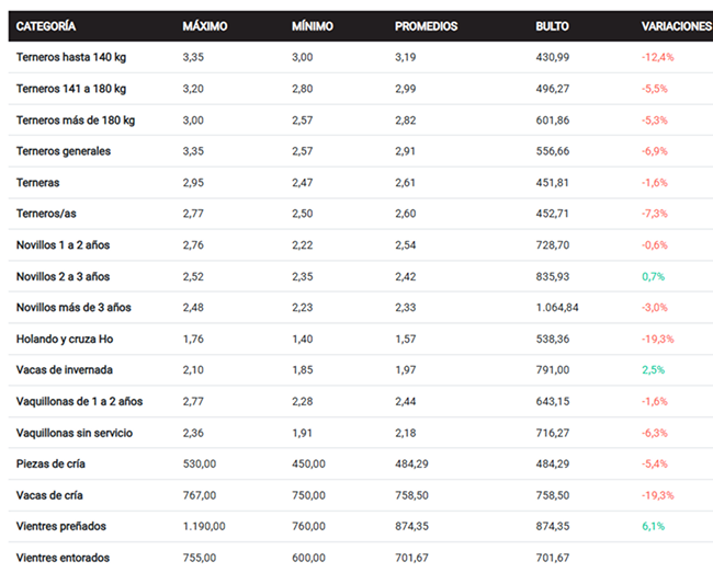 Por su lado, las vacas de invernada se valorizaron 2,5% e hicieron un promedio de US$ 1,97 por kg en pie (US$ 791 al bulto), al igual que los novillos de 2 a 3 años (+0,7% a US$ 2,42 por kg en pie). Las vacas de cría, por su lado, cayeron 19% a US$ 758,5, pero los vientres preñados se afirmaron 6% a US$ 874.
